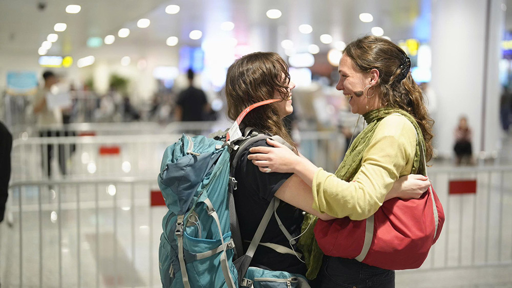 | Hành khách mừng rỡ khi rời chuyến bay từ Dubai đáp xuống sân bay Nội Bài, Hà Nội chiều 5.3 sau những ngày hoạt động hàng không bị gián đoạn vì chiến sự Trung Đông. Ảnh: NIA |