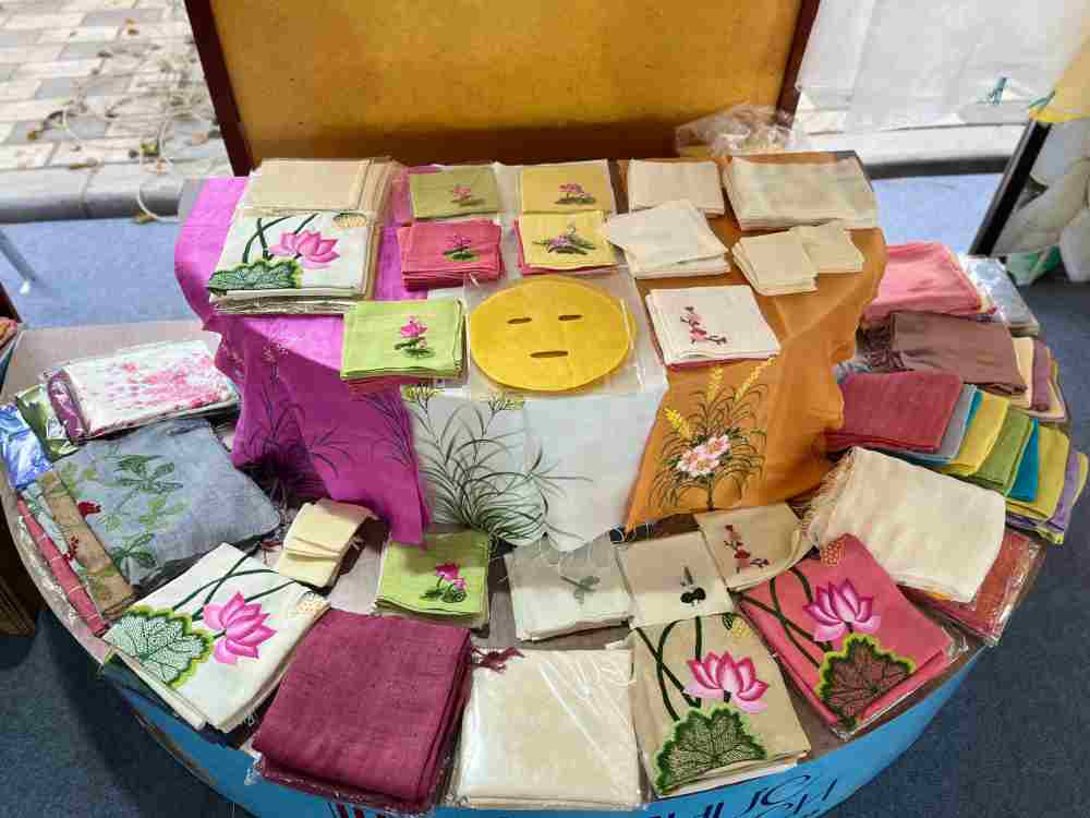 Tại gian hàng, nhiều sản phẩm thủ công 100% từ lụa tơ tằm như: khăn quàng, áo dài, gối phụ kiện từ phế liệu tơ được trưng bày. Sự tinh xảo thủ công kết hợp với thiết kế hiện đại khiến không ít khách tham quan dừng lại quan sát và trải nghiệm.