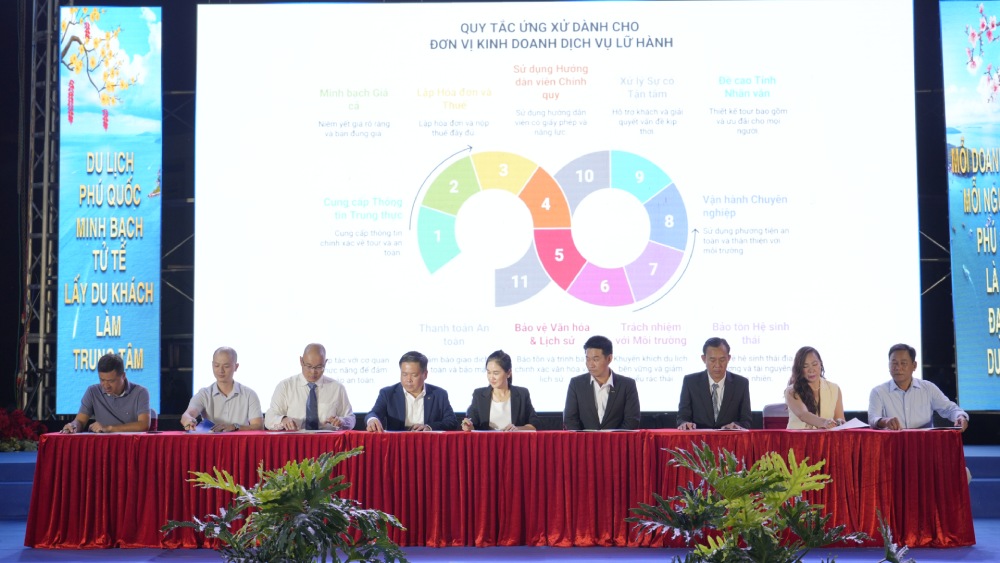 | Ký cam kết thực hiện nghiêm túc bộ quy tắc ứng xử du lịch Phú Quốc. Ảnh: Nam Phương |