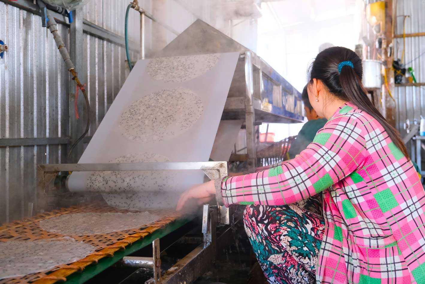 Trước đây, gia đình chị Thơ cũng làm thủ công, nhưng khi nhu cầu thị trường tăng vọt, sức người không còn đáp ứng nổi những đơn hàng lớn đi khắp các tỉnh miền Tây. Do đó, khi được hỗ trợ vốn vay từ địa phương, gia đình chị Thơ đã mạnh dạn đầu tư máy tráng bánh và vỉ phơi. Có máy móc, tốc độ sản xuất nhanh hơn, sản lượng tăng cao mà lại đỡ tốn công sức.