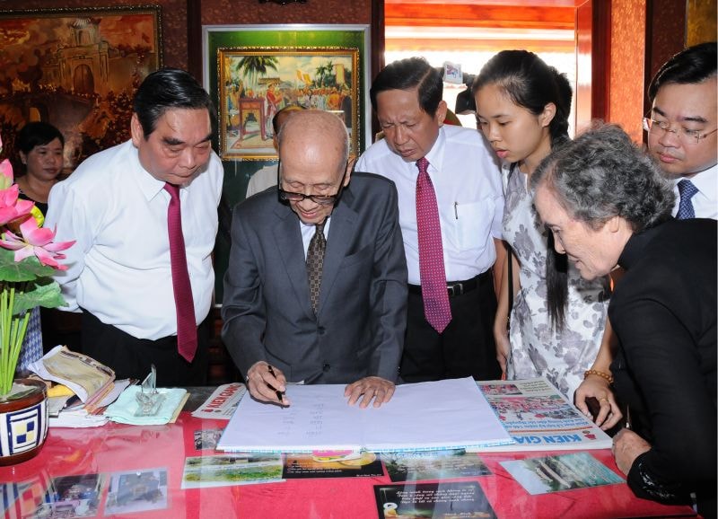 Giáo sư Vũ Khiêu (giữa), người viết Chúc văn lễ dâng hương Anh hùng dân tộc Nguyễn Trung Trực ghi lưu bút tại Đền thờ Anh hùng dân tộc Nguyễn Trung Trực tại Rạch Giá nhân dịp kỷ niệm sinh nhật lần thứ 100 của Giáo sư - Ảnh: Trương Vũ. |