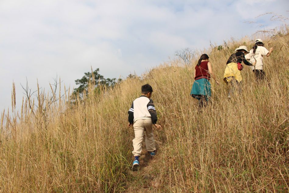 Chưa vội cắm trại ngay, chúng tôi tiếp tục leo lên đỉnh núi Thanh Mai, nơi được nhiều du khách chia sẻ có bãi lau rất rộng với tầm nhìn bao quát khung cảnh làng mạc phía dưới. Đường càng lên cao càng nhỏ, khúc khuỷu với hai bên chen kín cây sim, ổi rừng, lác đác sắc phong vàng. Chốc chốc qua những khe suối khô lại có cây đổ chắn ngang đường, phải trèo, thậm chí là luồn người lách qua. Khi ngẩng đầu lên, tôi đã thấy trời rộng nhiều hơn, và khung cảnh phía xa xa dần xuất hiện trong tầm mắt.