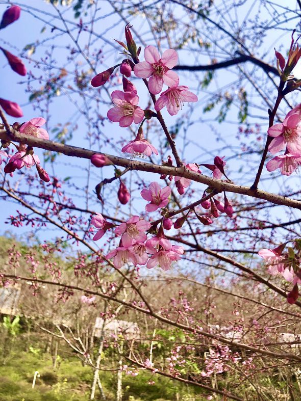 Ngay từ đầu tháng 1, mai anh đào đã bắt đầu hé nụ, rải những mảng hồng đầu tiên lên sườn núi. Khi bước sang khoảng giữa tháng, tiết trời ổn định hơn, hoa nở rộ, sắc hồng lan dần khắp xóm Mừng.