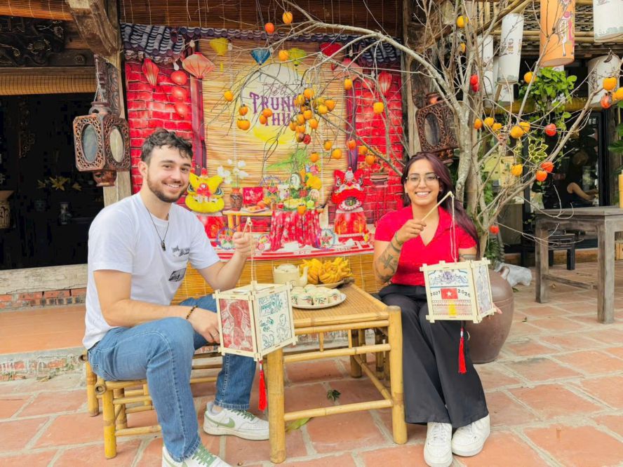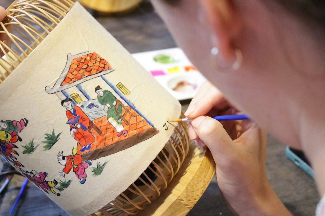 | Khách quốc tế thích thú khi được trải nghiệm làm đèn giấy dó. Ảnh: Nhân vật cung cấp |