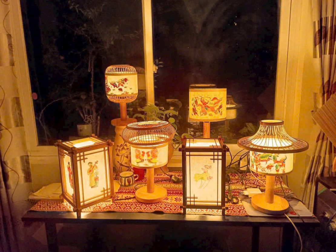 Điều đặc biệt làm nên linh hồn của đèn giấy dó là những bức tranh trang trí do họa sĩ Vũ Thái Bình trực tiếp vẽ tay trên nền giấy bằng màu nước. Những hình ảnh hoa sen, cảnh quê hương, cánh đồng, con trâu, mái đình... hiện lên mộc mạc mà tinh tế, tạo nên bản giao hòa giữa nghệ thuật dân gian và hơi thở đương đại. Khi ánh sáng xuyên qua lớp giấy, những nét vẽ ấy trở nên sống động như kể lại câu chuyện văn hóa Việt bằng thứ ngôn ngữ của ánh sáng và cảm xúc. Anh Ngọc nói rằng mỗi lần nhìn chiếc đèn hoàn thiện, anh lại thấy một thứ ánh sáng rất riêng ấm, dịu và có hồn - thứ ánh sáng mà anh tin chỉ có thể tìm thấy trong những điều mang hơi thở Việt.