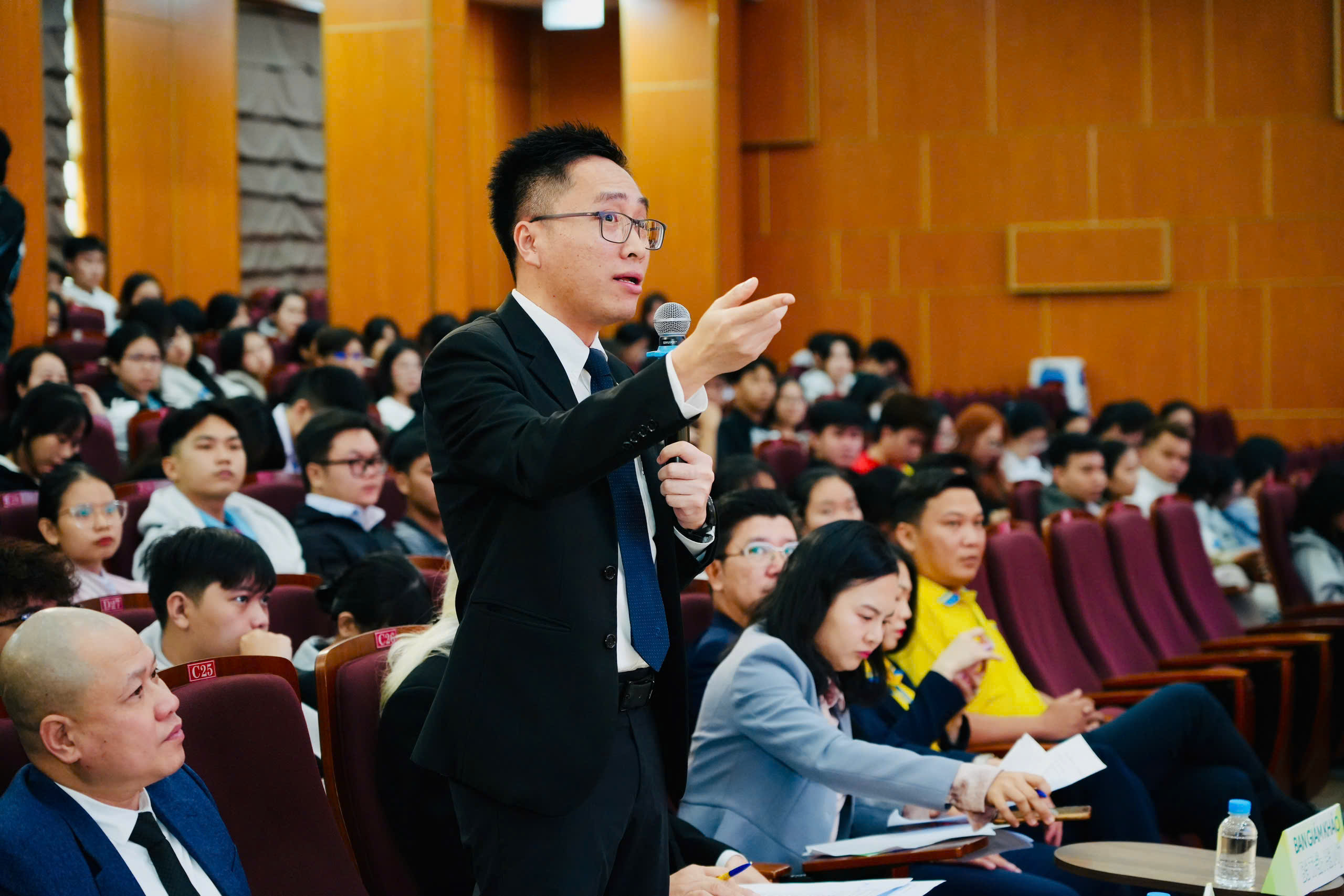 | Giám khảo TS. Tô Bá Lâm - Hiệu trưởng Trường Đại học Quang Trung nhận xét đội thi |