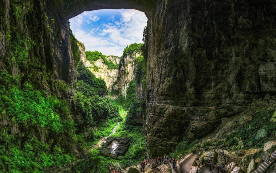 Đến đây, không thể bỏ lỡ nơi được UNESCO vinh danh là Di sản Thiên nhiên Thế giới năm 2007 – di sản thứ sáu của Trung Quốc và duy nhất của Trùng Khánh – công viên địa chất Vũ Long. Vũ Long là quần thể karst nổi bật với ba kỳ quan tiêu biểu: Thiên Sinh Tam Kiều, động Phù Dung, Hố sụt Thiên Tỉnh Sơn. Sự kết hợp giữa cầu đá vôi tự nhiên khổng lồ, hang động thạch nhũ kỳ ảo và hẻm núi sâu hàng trăm mét đã biến Vũ Long thành điểm đến đặc sắc, thu hút hàng trăm nghìn du khách mỗi năm. Nơi đây từng là bối cảnh của nhiều bộ phim nổi tiếng như “Transformers 4”, “Thần điêu đại hiệp”, hay show truyền hình “Running Man Trung Quốc”. Đến đây, du khách sẽ phải ngỡ ngàng trước kiệt tác thiên nhiên và sự tươi đẹp mà nó mang lại cho du khách tham quan.